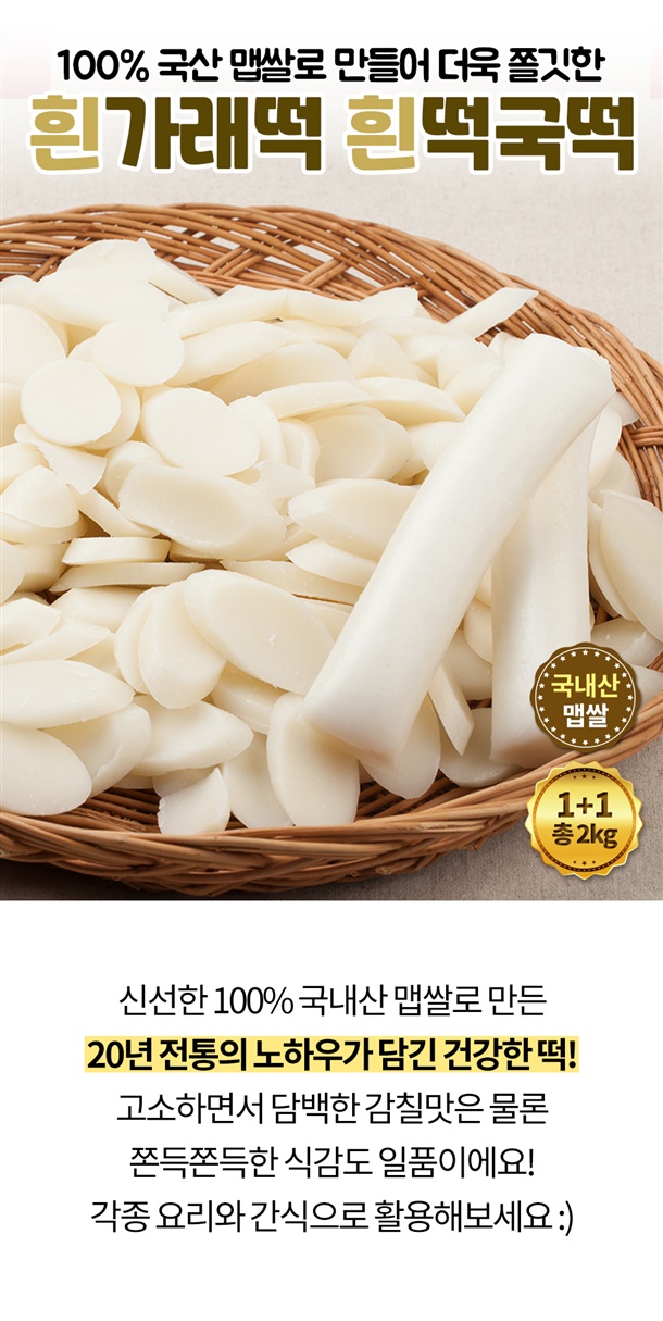 국내산 맵쌀로 만든 흰가래떡/떡국떡 1kg+1kg